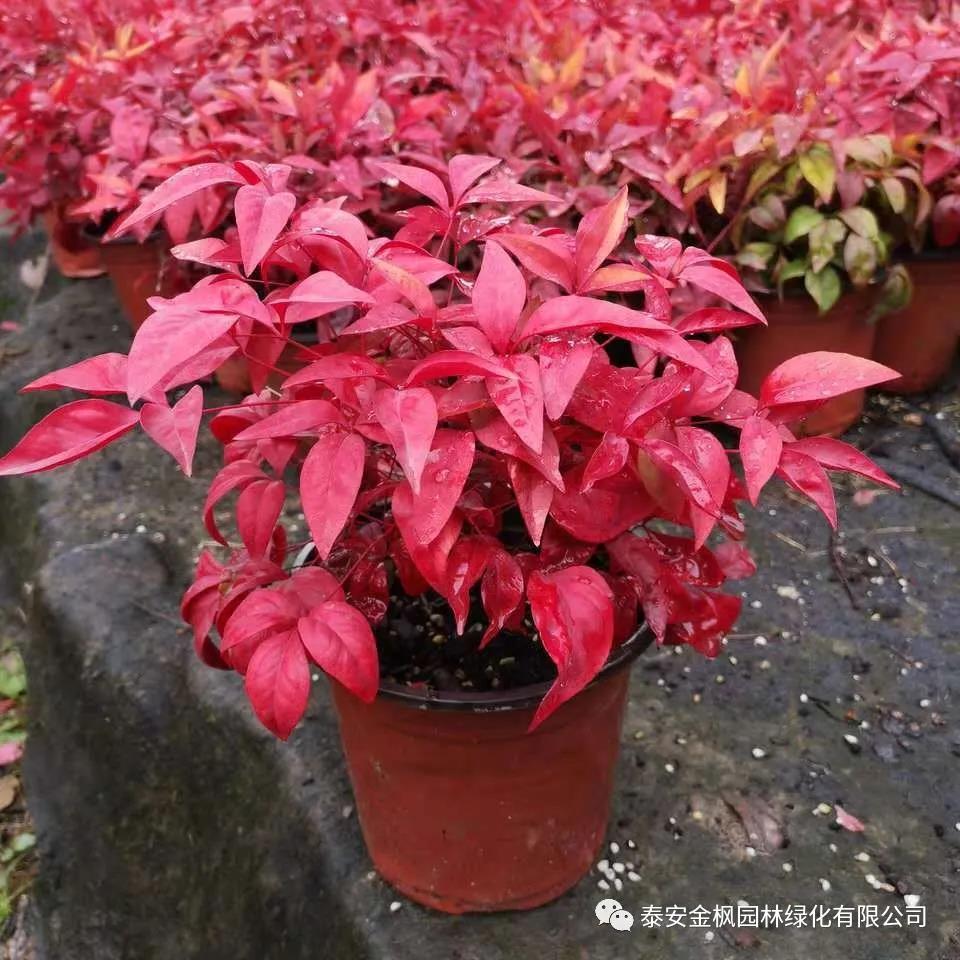 火焰南天竹是一種常綠灌木,多年生植株,株高可達(dá)60-90cm,叢生而多分枝,節(jié)間特短,枝葉濃密,株型緊湊,2-3回羽狀復(fù)葉互生,葉片為橢圓形或卵形全緣葉,春、夏、秋三季葉色深綠,隨著氣溫的降低,12月中下旬當(dāng)氣溫低于5攝氏度持續(xù)一周時,葉片開始變紅,經(jīng)霜不落,可持續(xù)到來年3-4月,葉色艷麗。是非常適合栽培觀賞的灌木品種,也是極佳的園林美化品種。四季紅南天竹作為小檗科,南天竹的一個新品種,高60-120cm,叢生而多分枝,枝葉濃密,樹形緊湊。葉互生,2-3回羽狀復(fù)葉,總?cè)~軸上有小節(jié),基部有苞莖鞘:小葉橢圓形,長5-10cm,寬3-5cm,先端鈍尖,基部楔形,全緣,薄革質(zhì),一年四季紅葉,耐寒性好,抗病性強!可做成地被和色塊,鋪地中國紅,給以興旺發(fā)達(dá)之寓意。是觀葉優(yōu)良地被和色塊樹種,有廣闊的市場前景。